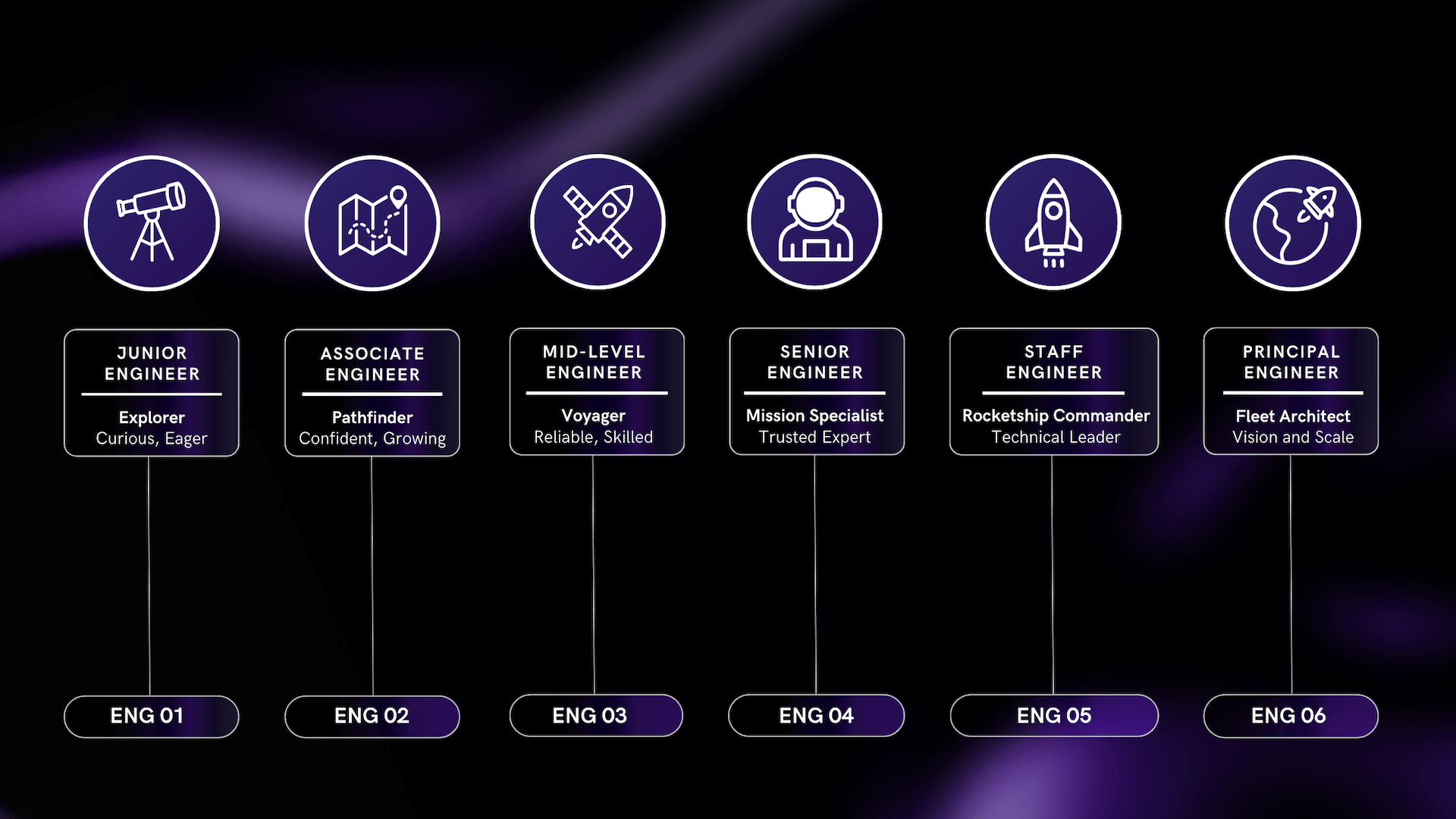 We know that Staff level (Eng 05) and Principal (Eng 06) are where definitions can blur. In larger companies, these roles focus heavily on architecture and cross-team collaboration. In a smaller company like ours, these roles can take many forms, from strong technical leaders to hybrid strategists. They are crucial for executing our strategy and keeping the team aligned on our north star, whilst still remaining very hands-on. We continue to refine these levels with input from the team and through external benchmarking.