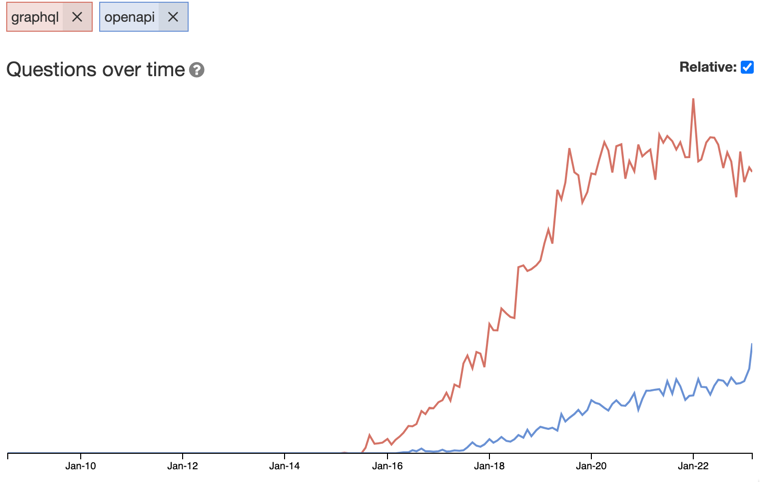 Another important observation we can make is that there are 3.4 times more questions about GraphQL than OpenAPI. Honestly, this is surprising to me. Considering that REST is by far the most dominant API style, I would have expected the opposite.