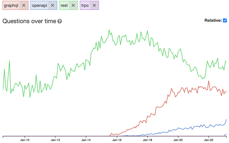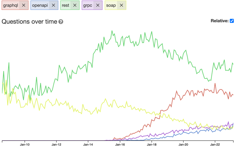 According to this graph, both GraphQL and REST are quickly dying, while OpenAPI, SOAP, and gRPC are more or less irrelevant.