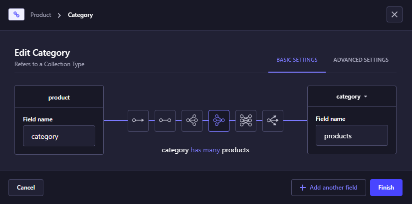 The Strapi admin dashboard lets you quickly build the schema for your data without having to fiddle with the actual relational database. Strapi calls these models Content Types. They're pretty intuitive, all you have to do is create a new Content-Type, and add the fields that your products need.