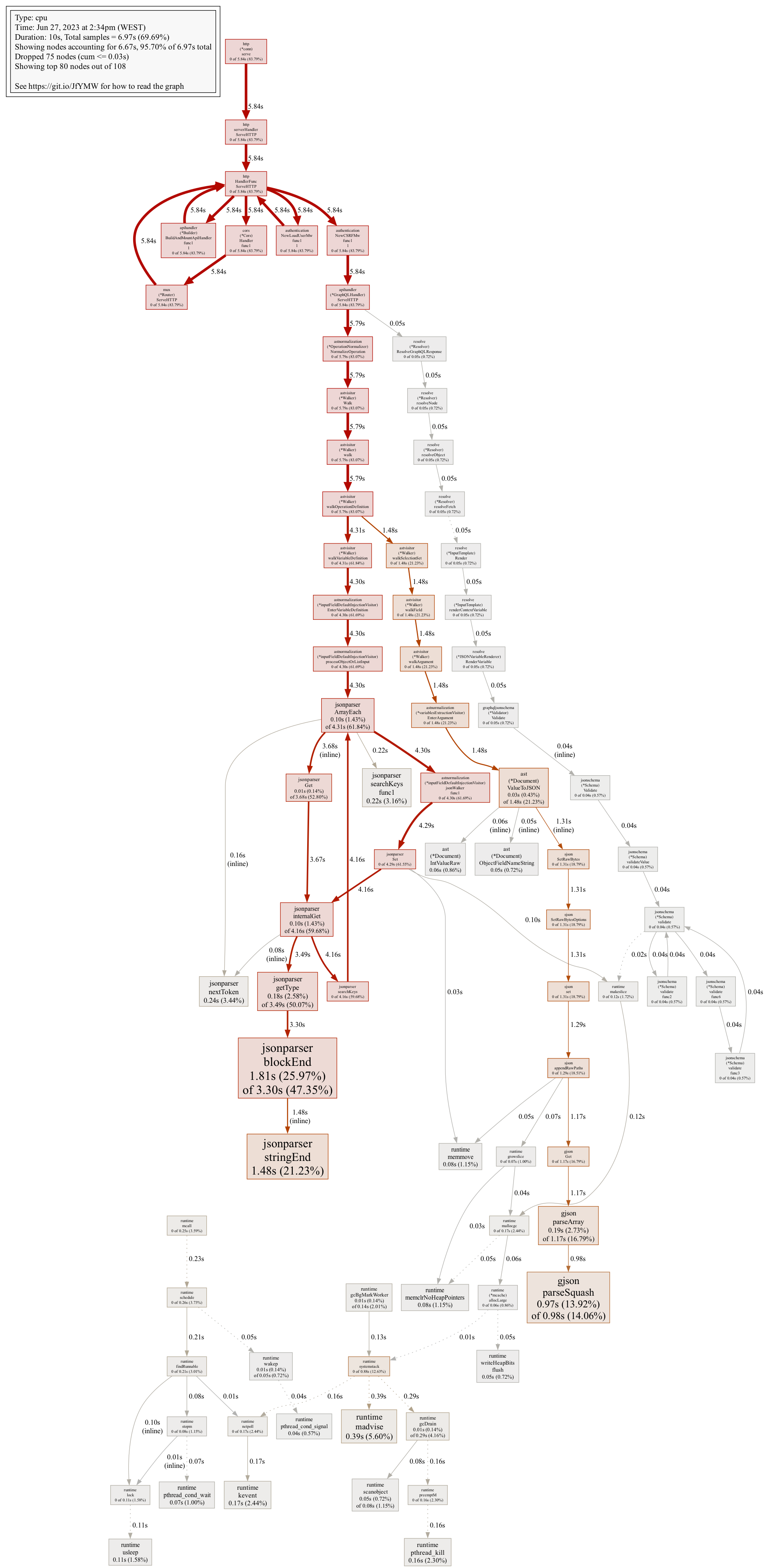 Following the red lines, we can see a lot of the time is spent in manipulating JSON-encoded data. As you might already know GraphQL uses JSON when transported over HTTP, which means a gateway needs to decode a JSON payload, perform some work on the data and then encode it back to JSON to send it upstream.