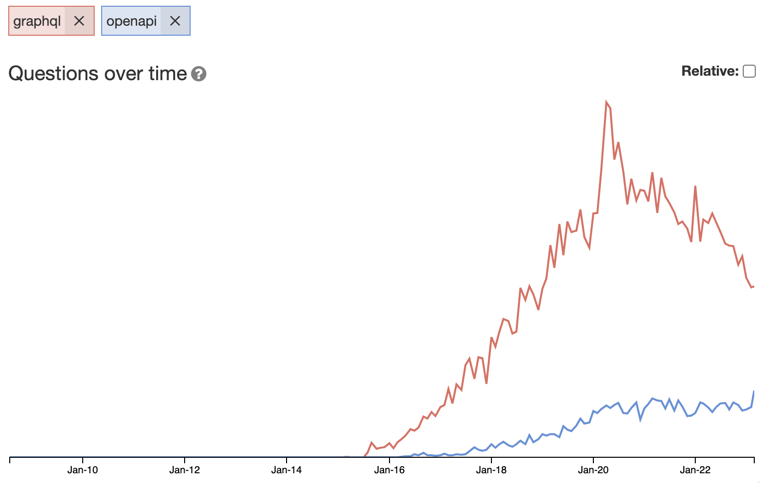 OpenAPI on the other hand is steadily growing. Switching from absolute to relative shows an even stronger trend for OpenAPI.