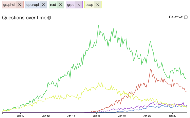 GraphQL is still going sideways. REST is in a slow decline. SOAP is in a slow decline as well. Both OpenAPI and gRPC are slowly climbing in popularity.